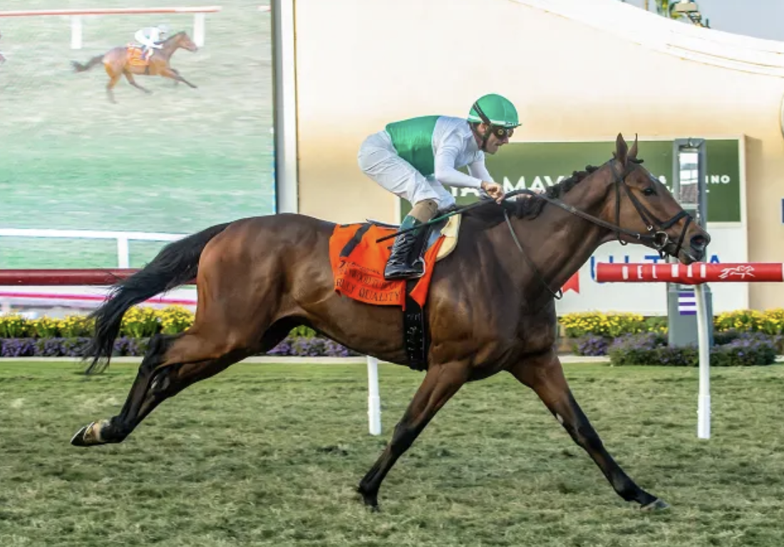 TRULY QUALITY proved himself the best with with a “black friday” win in the Hollywood Turf Cup-G2 at Del Mar on Nov. 28. A homebred racing for George Strawbridge’s Augustin Stable, the five-year-old gelding by Quality Road now has victories back-to-back runnings of the 1 1/2-mile feature. In this year’s rendition, TRULY QUALITY settled toward the back of the pack early on, came to the outside to draw closer, then began his run in earnest into the turn. He took the lead with an eighth of a mile to go, then drew clear for a 1 3/4-length win.